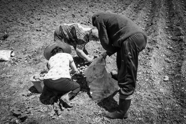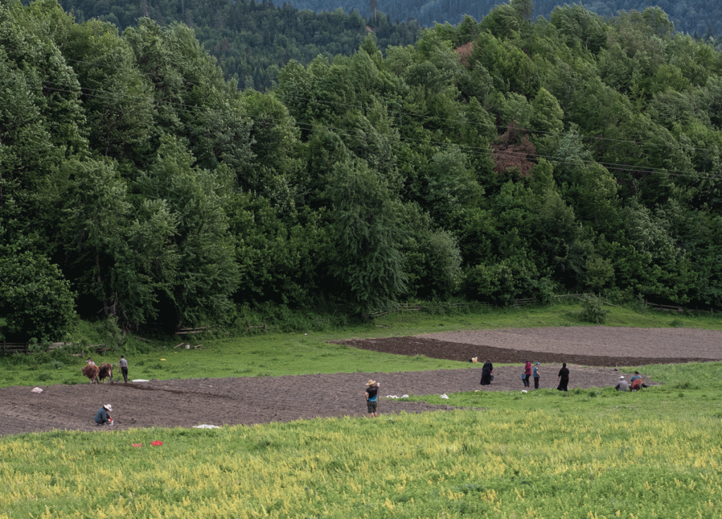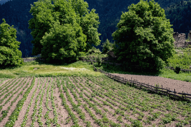 At the end of September, there is the least water, but then it is no longer necessary for agriculture. There is never a lack of water in Svaneti, at most, it happens that the water vein of a village freezes over in winter. Some fields always carry only rye. „We’ll fertilise them,“ said the Svans. In others, they consider crop rotation. „In Zageri,“ said my grandfather, „we don’t have enough land for that. Otherwise, we would, since it’s good for the soil. As long as the crops are young and low, the plants are weeded. Plant diseases occur. In specific fields, the seeds are exposed to the danger of freezing. Bad harvests are usually limited to only one plant, but they happen often enough; in 1894 Tatarchan Dadeschkeliani had to bring rye and corn from Zageri. This year the harvest will be of medium yield (1903). We don’t desire rain, as it is harmful. The peas thrive at the highest point of the mountain. They are sown, harvested and threshed like the; we finish their harvest at the beginning of September. According to a rough estimate, Ezeri has 5 square kilometres of cultivated land, of which about 30% is meadows, 30% grain, 40% other field crops. Pumpkins and melons thrive well in the garden.“
