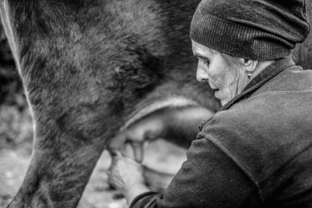 The dairy cows necessary for the calves stay near the village in summer. The remaining cattle and the horses are sent to pasture in the mountains during the day. All animals are then driven back to the farm at night. The cows are milked in the morning and evening. An outstanding cow gives 7 litres of milk, as an average I observed 3 to 4 litres. Some cows continue to give milk after the calf was slaughtered, some then go on strike. During milking the maid superficially brushes the dirt off the udder. If there is already milk in the wooden bucket, she wets the teats with it. She grabs two adjacent teats between thumb and forefinger of each hand. She pulls on them vigorously and regularly, which gives about two squirts per second.