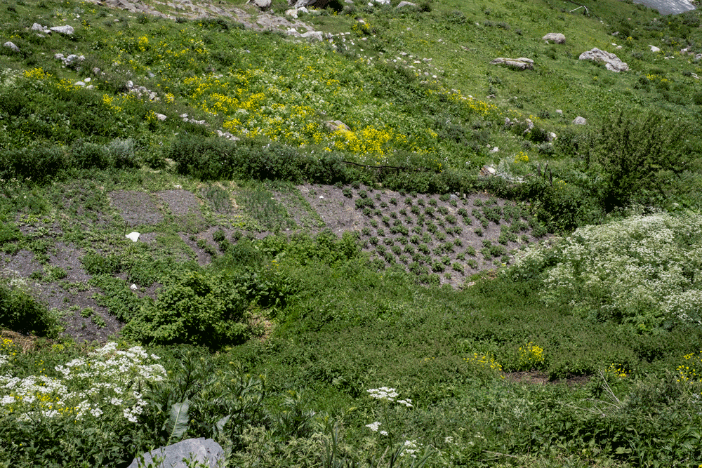 The alpine meadows show an incredible variety of vegetation with knee-deep grasses (see Levier’s botanical journey in the Caucasus). Haymaking takes place in August, at the beginning or end of the month, depending on the altitude. If the slopes are easily accessible, hay mowing takes place up to a height of 3000 m. There is no butter in Svaneti [as a dairy product].