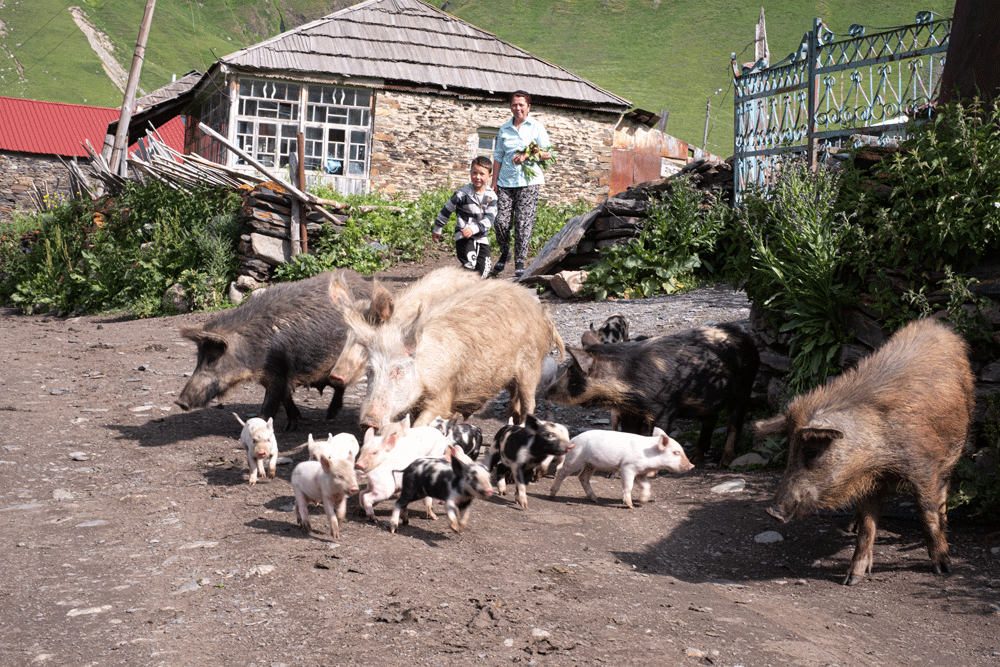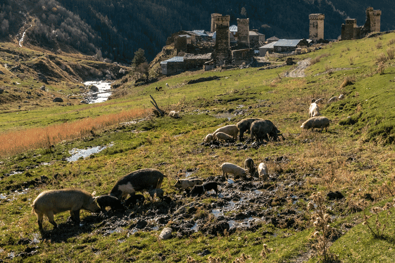 Prince Dadeschkeliani had turkeys brought to Svaneti, but none of the villagers does have one. Of all animals, pigs are the most left to their own devices. In the evening, however, they are driven home. They act both as lavatory cleaners and street cleaners. Nevertheless, the pigs are supposed to be utterly free of trichinae.