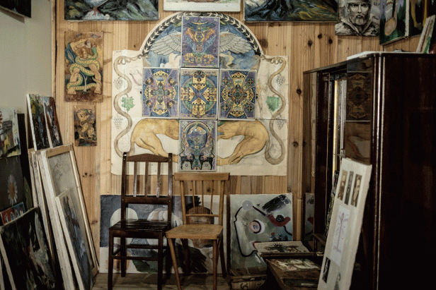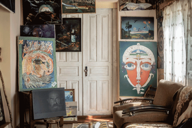 His pictures are dualistic and anti-realistic, he explains. He had learned nothing in Tbilisi, where they had tried to force him into socialist realism. Van Gogh had schizophrenia, he exclaims. He also had schizophrenia. He was diagnosed in 1973 when they held him in a psychiatric hospital.