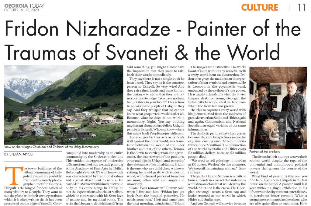 Stefan Applis (2020): Fridon Nizharadze – Painter of the traumas of Svaneti and the world. Georgia Today, October 16 – 22, p. 11